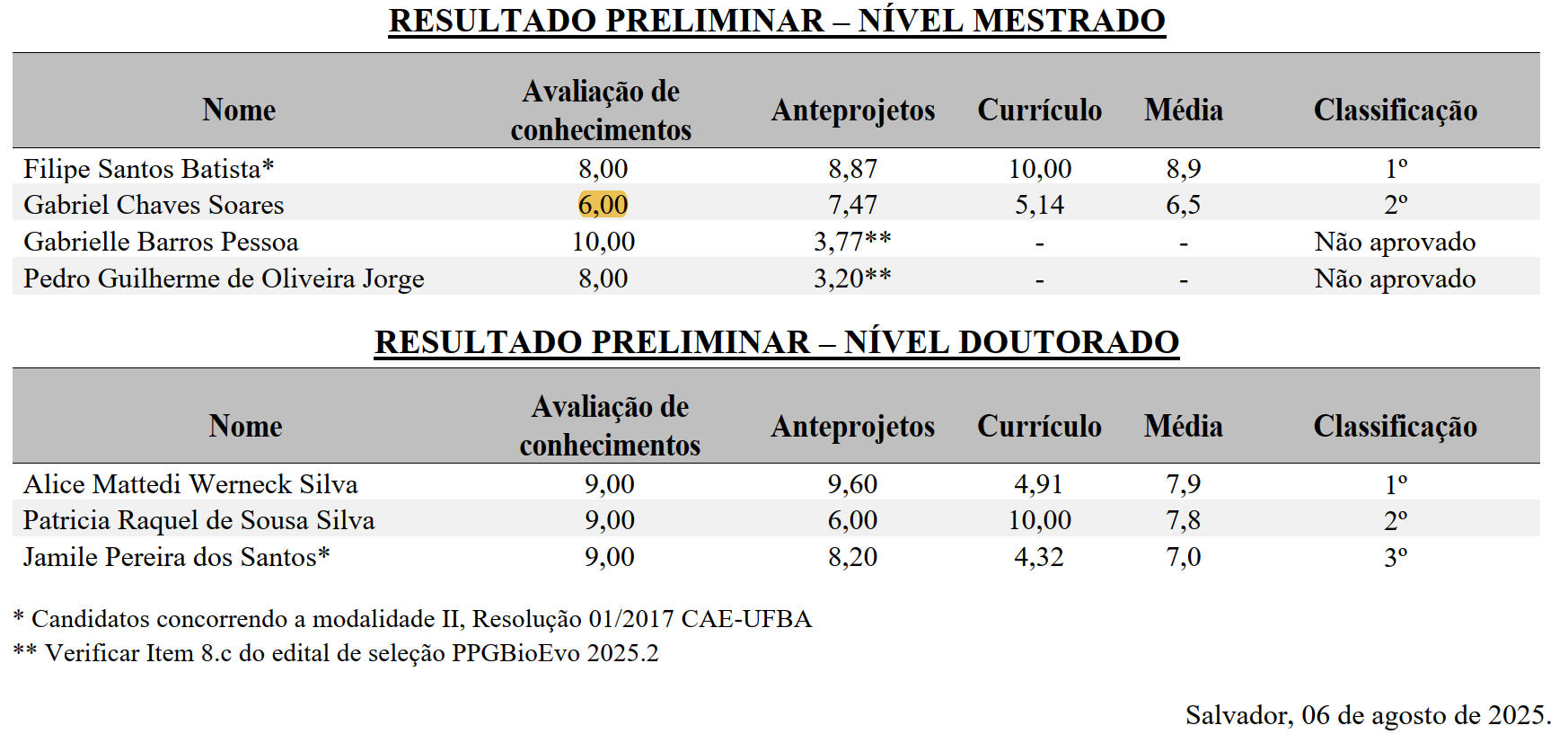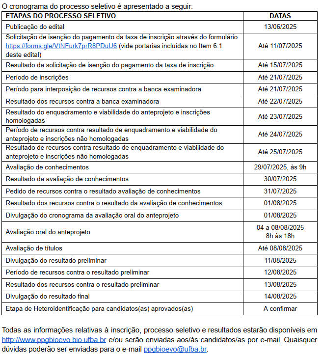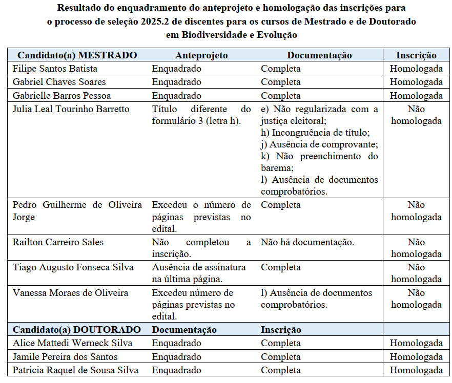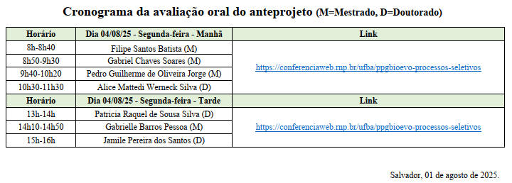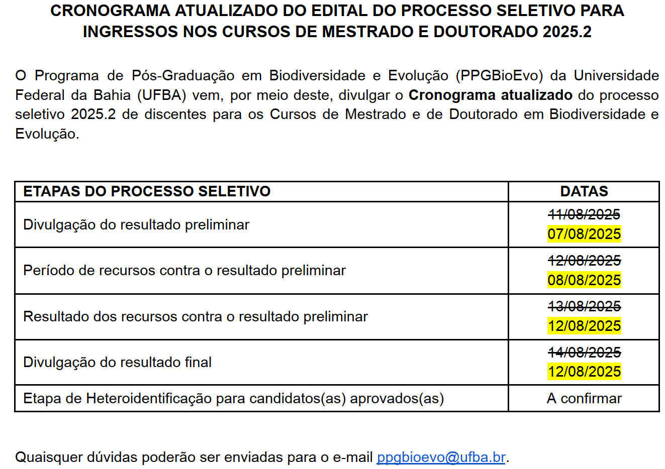 DOUTORADO O Programa de Pós-Graduação em Biodiversidade e Evolução (PPGBioEvo) da Universidade Federal da Bahia vem, por meio deste Edital, convocar candidatos interessados a se inscreverem no processo de seleção 2025.2 de alunos para os Cursos de Mestrado e de Doutorado em Biodiversidade e Evolução.