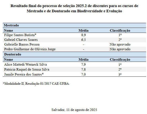 A Coordenação do Programa de Pós-Graduação em Biodiversidade e Evolução da Universidade Federal da Bahia, no uso de suas atribuições, torna público, por meio deste Edital, as normas da seleção de alunos/as especiais para cursarem disciplinas ofertadas pelo Programa no Semestre 2025.2, em conformidade com o Regulamento de Ensino de Graduação e Pós-Graduação stricto sensu da UFBA e o Regimento Interno do Programa.