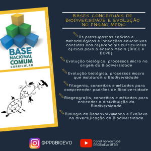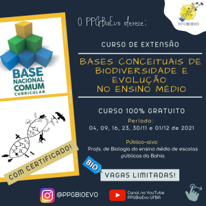 2021.2 - O Programa de Pós-Graduação em Biodiversidade e Evolução do Instituto de Biologia da Universidade Federal da Bahia (PPGBioEvo/IBIO/UFBA) tem o orgulho de anunciar o segundo curso de extensão voltado para Professores da Educação Básica. - O Curso "Bases conceituais de Biodiversidade e Evolução no Ensino Médio" faz parte do Programa de Extensão Universitária "Diálogos em BioEvo". Neste curso, serão apresentados e discutidos os principais conceitos de Biodiversidade e Evolução no Ensino Médio, de acordo com os pressupostos teóricos e metodológicos e intenções educativas dos referenciais curriculares oficiais (BNCC e DCRB). - Carga horária total: 40h - Formato: on-line, - Período: 04, 09, 16, 23, 30/11/2021 e 01/12/2021 - Horário: das 18 h às 20h - Endereço: canal do YouTube PPGBioEvo UFBA. - Inscrições: GRATUITAS, de 21 a 28 de outubro através do link: https://forms.gle/6pM3LN96GupT8uqH9 - Informações adicionais: http://www.ppgbioevo.bio.ufba.br/Extensao.html e sigam o nosso Instagram @ppgbioevo. |