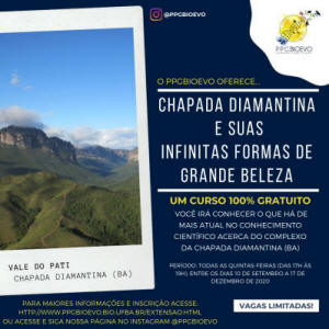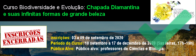 2020.2 - Curso Biodiversidade e Evolução: Chapada Diamantina e suas infinitas formas de grande beleza (evento gratuito) - Curso do Programa de Extensão Universitária "Diálogos em BioEvo" do Programa de Pós-Graduação em Biodiversidade e Evolução do Instituto de Biologia da Universidade Federal da Bahia (PPGBioEvo/IBIO/UFBA). - Período de Inscrição: 03 a 09 de setembro de 2020. - Período do Curso: 10 setembro a 17 de dezembro de 2020 (5as feiras, 17h–19h). - Carga horária total: 80h. - Público alvo: docentes de Ciências e Biologia. - Link para Inscrição: https://forms.gle/JVVK6BP8DQwQPW6p8 |